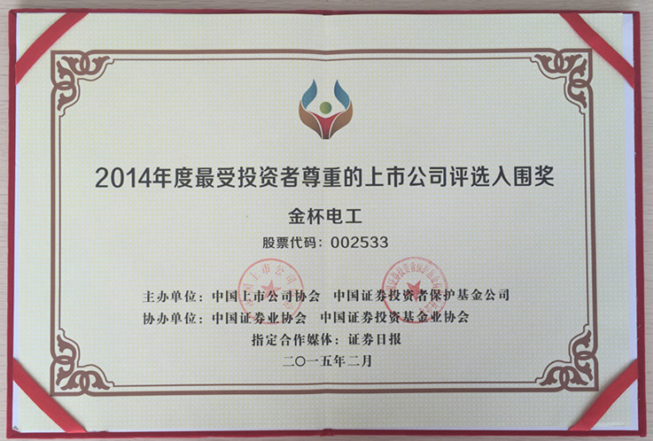 金杯電工榮獲“2014年度最受投資者尊重的上市公司評選入圍獎”