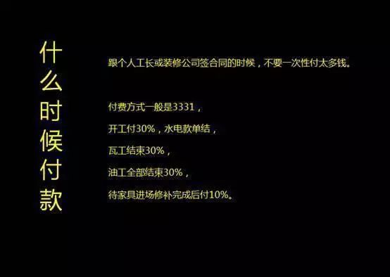 有的裝修業(yè)主一開始就付50%,如果中間出了問題,不利于裝修質量管理。極少數(shù)大裝修公司硬性規(guī)定開工付50%,中期付45%,竣工付5%。一般的裝修公司一般都能接受3331的方式。