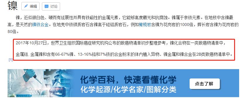 百度百科:2017年10月27日,世界衛(wèi)生組織國際癌癥研究機構(gòu)公布的致癌物清單初步整理參考,鎳化合物在一類致癌物清單中,金屬鈷, 金屬鎳和含有66-67%鎳、13-16%鉻和7%鐵的合金粉末的體內(nèi)植入異物、鎳金屬和鎳合金在2B類致癌物清單中。